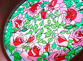 存在感のある赤い薔薇の大きなステンドグラスはハンドメイド。非日常な空間を演出してくれます。